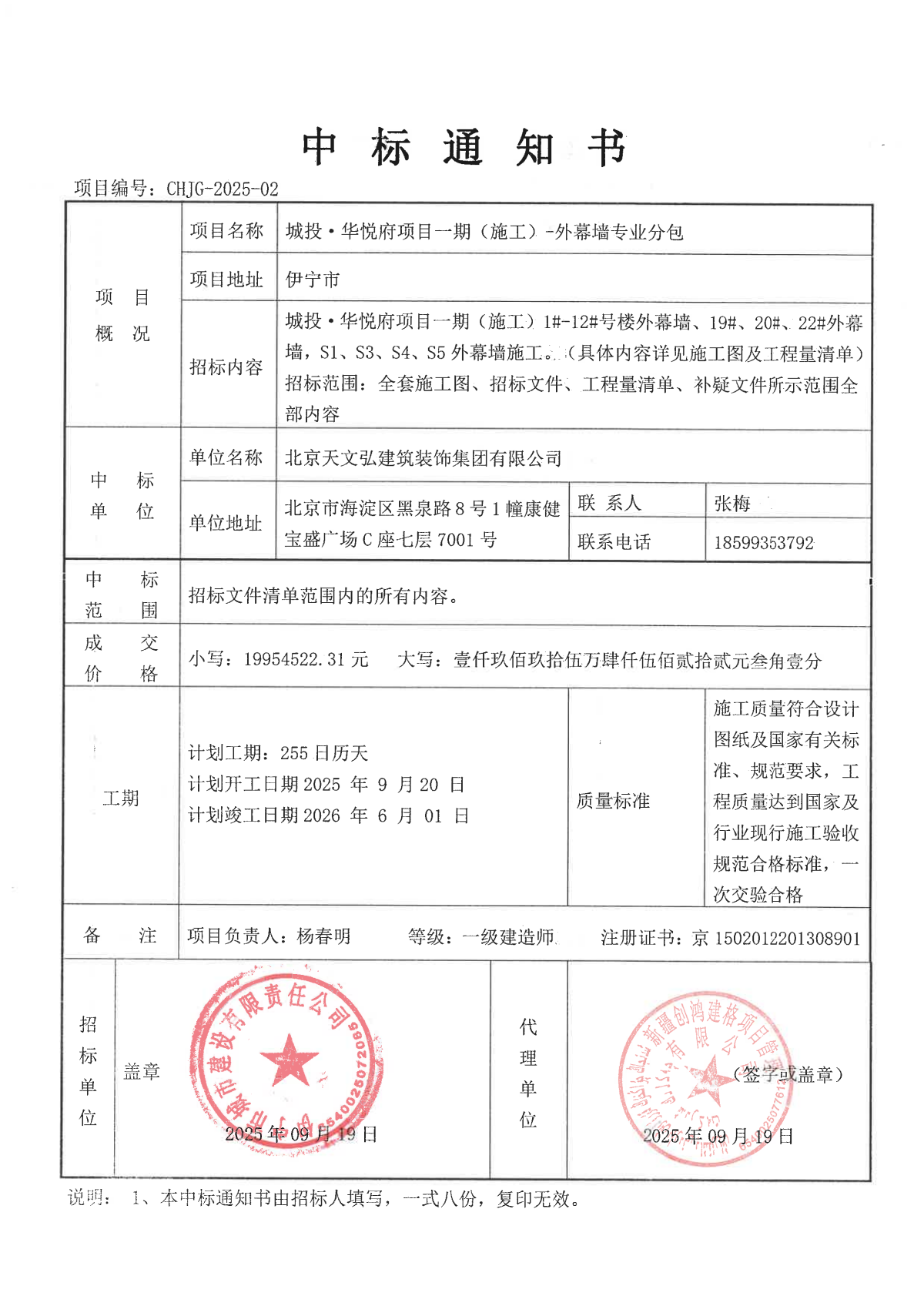 近日,北京天文弘建筑裝飾集團(tuán)有限公司憑借雄厚的技術(shù)實(shí)力與豐富的行業(yè)經(jīng)驗(yàn),成功中標(biāo) “城投·華悅府項(xiàng)目一期(施工)--外幕墻專業(yè)分包”項(xiàng)目(項(xiàng)目編號(hào):CHJG-2025-02),這一成果不僅是對(duì)我司專業(yè)能力的充分肯定,也為公司在西北地區(qū)市場(chǎng)拓展奠定堅(jiān)實(shí)基礎(chǔ)。